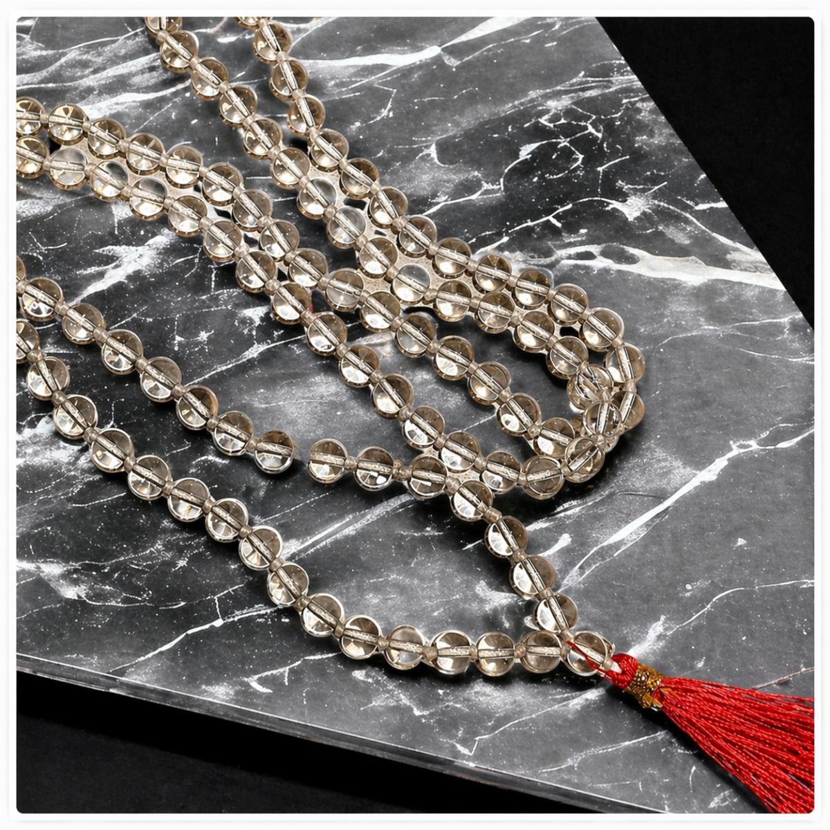 Mala magnifique en cristal de roche spadigam d'Inde du Sud trouvé par nos soins.
